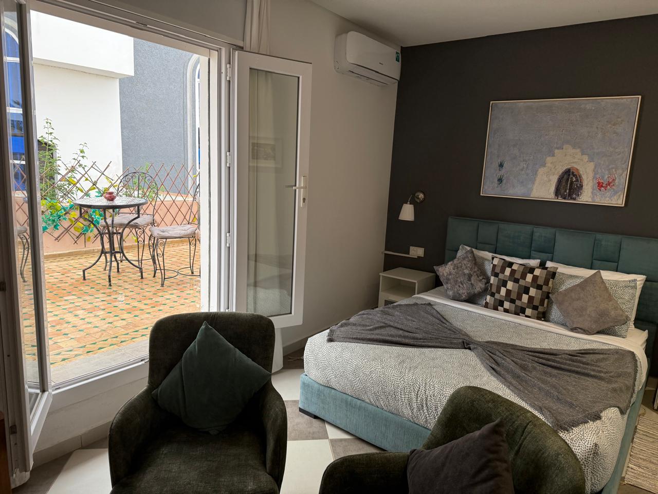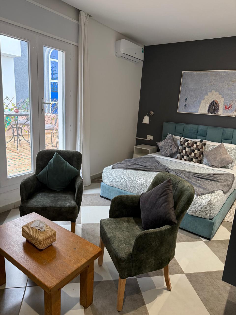 Cette chambre de luxe offre un espace élégant et raffiné, conçu pour un confort absolu. Elle dispose d’un grand lit king-size avec une literie haut de gamme, ainsi que d’un mobilier moderne aux finitions soignées. La chambre s’ouvre sur une terrasse privée, aménagée avec du mobilier extérieur, idéale pour se détendre en toute intimité.